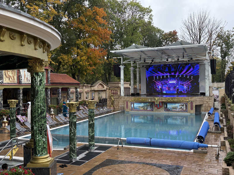 300人収容の巨大サウナ室とジャグジー、奥に大きなプールがあり、ステージ上のモニターでサウナ室内が中継されていました