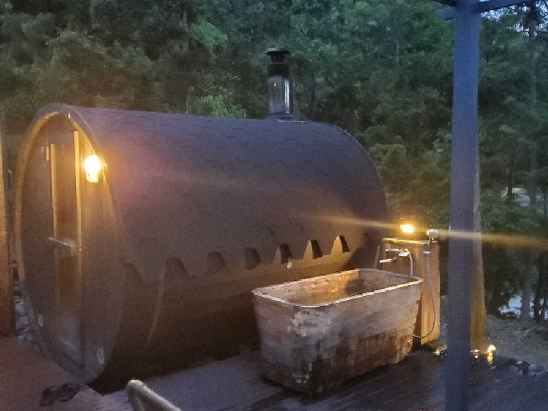 貸切サウナ 薪ストーブで熱するバレルサウナ「ilma(イルマ)」 薪の量でお気に入りの温度に調整できます。もちろんセルフロウリュもやり放題です。ロウリュは天然のバーチの香り。半円窓から見える景色はまるで海外!このロケーションはサウナ時も整いタイムも最高の時間を約束します。 雨の日の外気浴も安心!タープがあるので大丈夫!