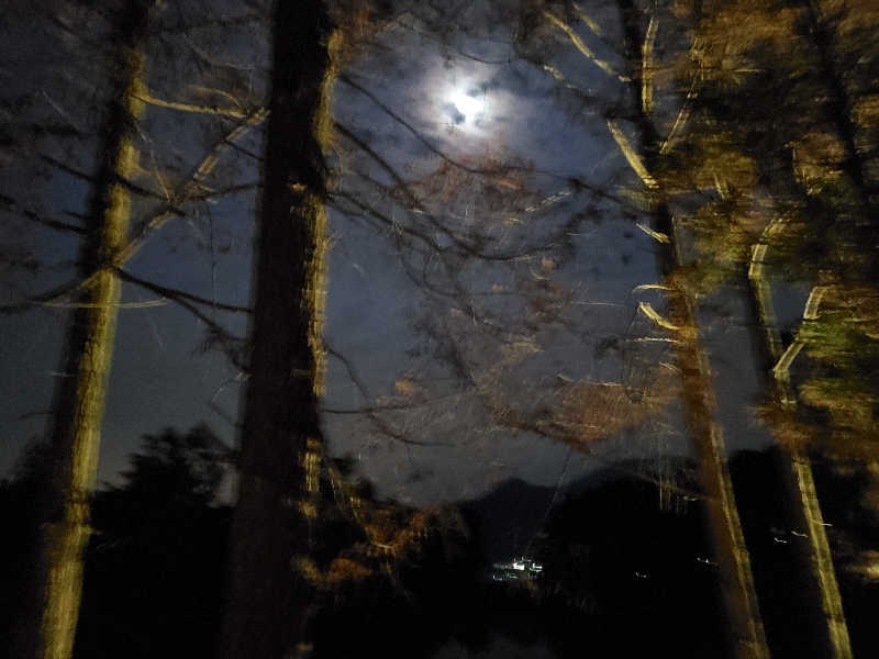 うっすらと木々と池を照らす月も雲に隠れたり現れたりと幻想的。