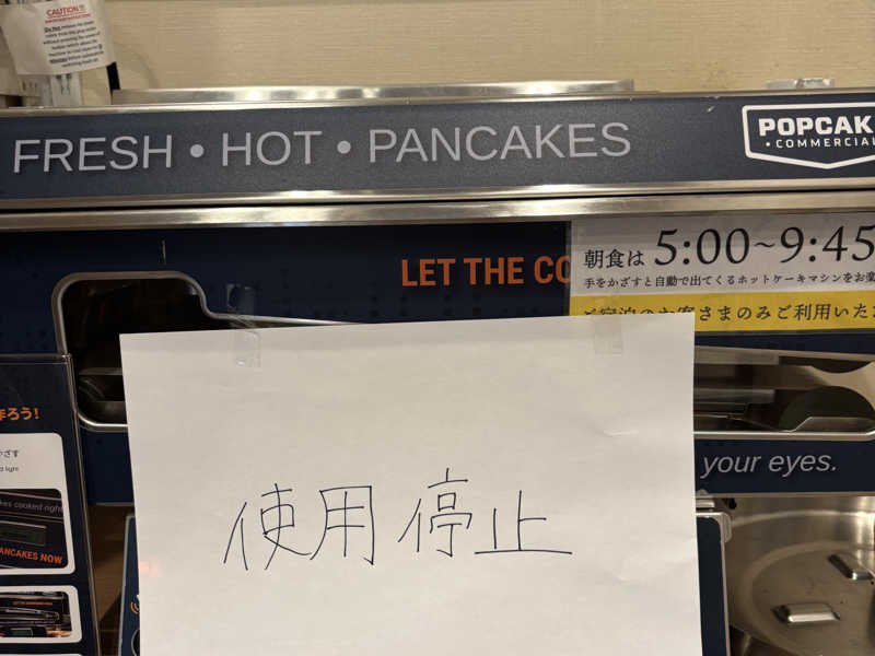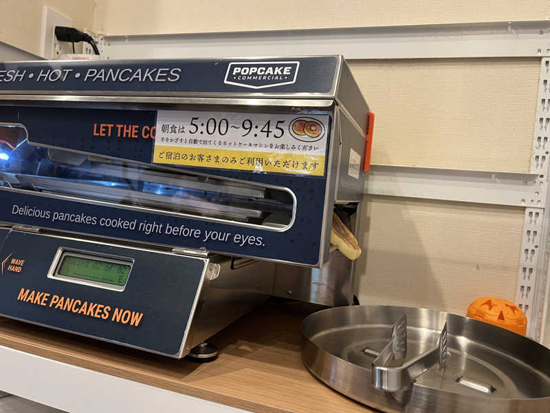 朝食サービスのパンケーキ! キャラメルソースとチョコソースあり。 自動で出来るのを見るのが楽しい!