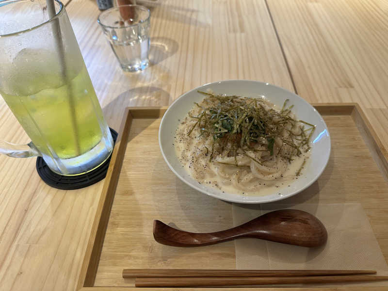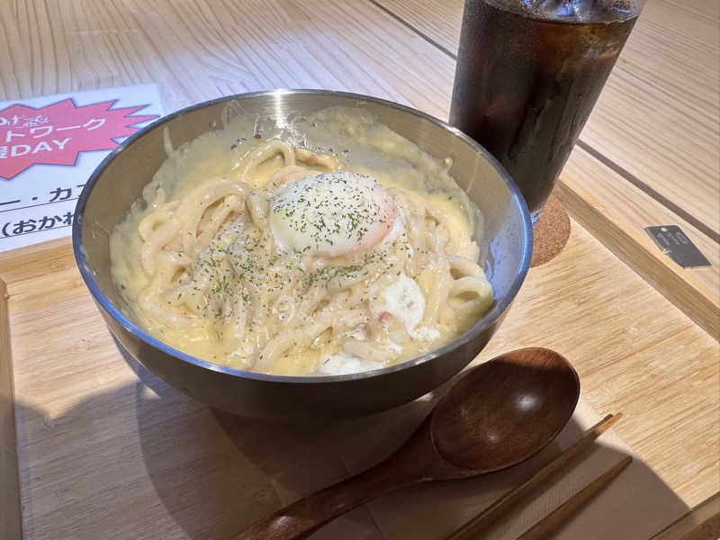 カルボナーラうどん(期間限定420円) アイスコーヒー(イベントで無料)
