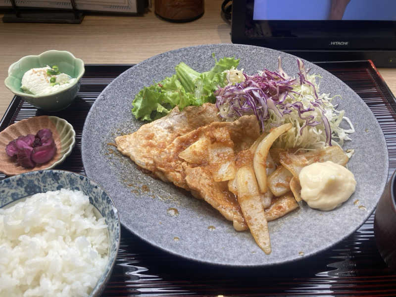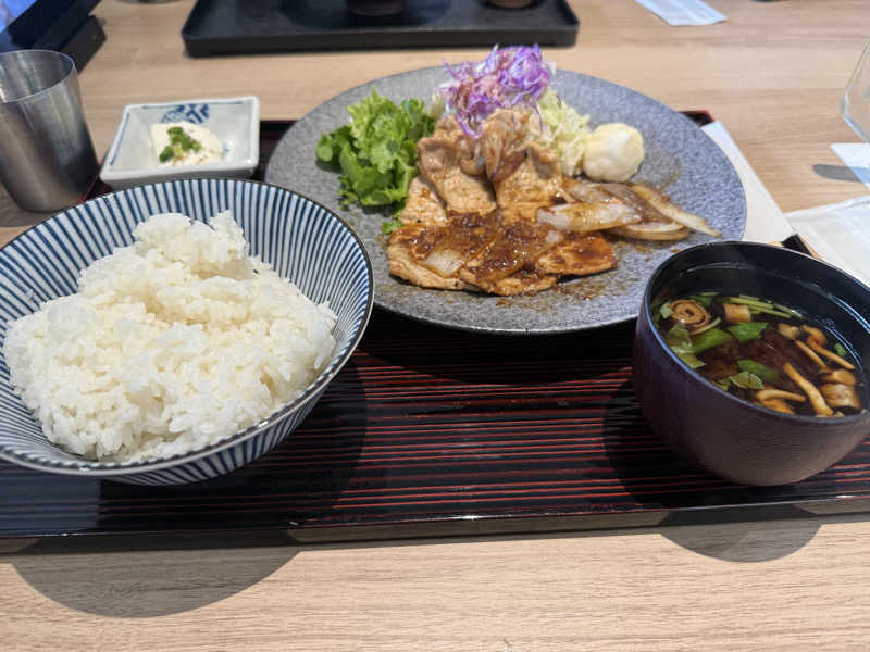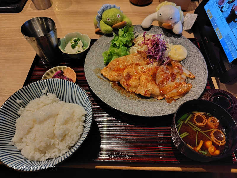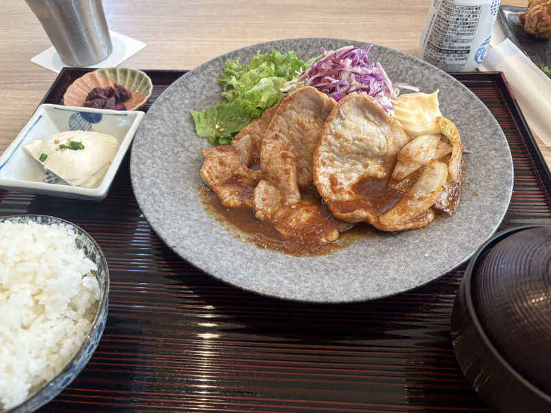 肉大きい、生姜きいてる、キャベツ多い、赤だし味噌汁、全部おいしい
