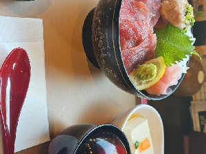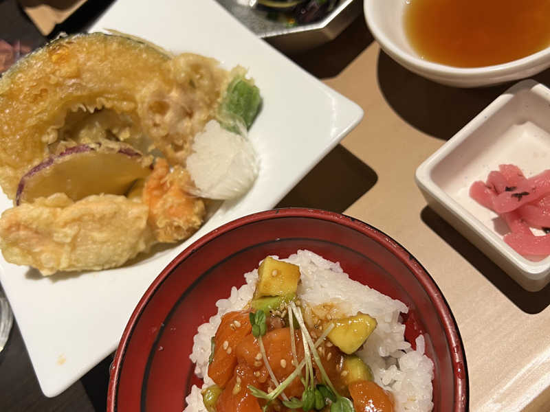 サーモンとアボガド丼もうどんも天麩羅も全部美味しい!