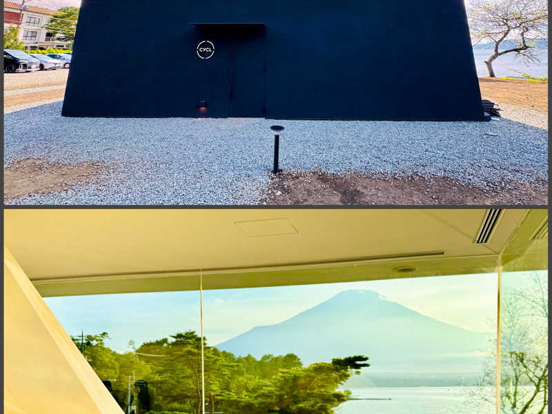 それで、山中湖の近くの宿に泊まり、飲み明かして朝一で向かったのは……待ち望んでました。本当にずっと行きたかった!!CYCLに行くことが出来ました!!!いやーー素晴らしい天気でした!!(大雨洪水) さあ!!いやまずね外見がとにかくオシャレすぎました😭✨ まじ来た時えっ?美術館やんけ?間違えた?って思うくらいとてもサウナ室とは思えない空間でした✨