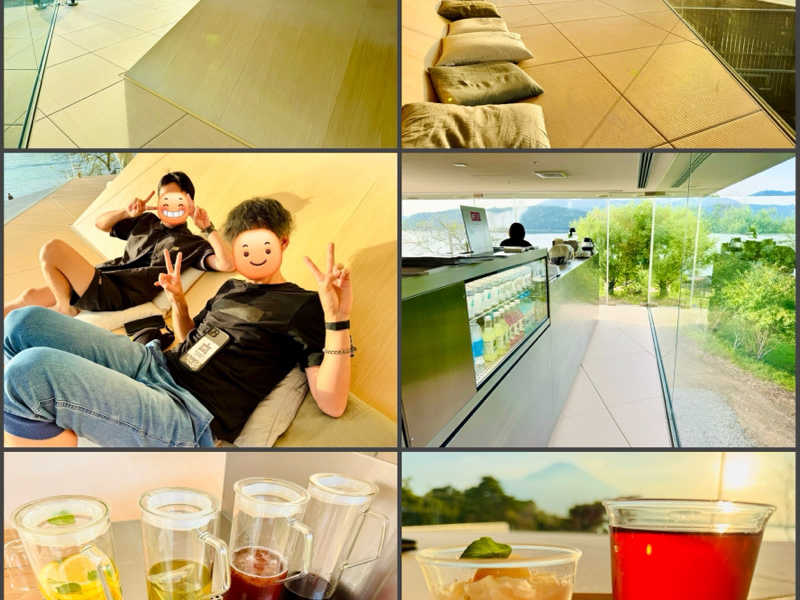 予約受付完了して…いざ!入場!!ここはサウナ室が男女混合型で水着着用だったので高校生ぶりの水着に着替えていざ!!サウナ室に!!って待て待て✋いやめっちゃ富士山🗻エグすぎるやろ!!!マジでスゴすぎる!!って言いたかったんですが…あいにくの雨でそんなことはなく、もう真っ白笑笑 サウナ室に入場。いやーサウナ室もオシャレすぎる✨ セルフロウリュー型でとにかく最高に熱い空間を自分たちで作れるそんな場所でした!!匂いも最高でとにかくしつかり温まったら、天然の富士山水流し型水風呂にダイブイン!!ここは頭までしつかりと憑かれる場所でさらに!!水が飲める!!天然水が飲めちゃうんですよ!!それがとにかく最高に整いに必要な水で最高に美味かった👍👍 水風呂に浸かったら外気浴でリクライニングチェアに着席!!いやーー整いが半端ないって朝からこんなに整えるなんてそんなん聞いてないやん普通。こんなところできる場所ある??言っといてや出来るんやったら!あーもうこれは完璧や全部完璧。外見だけやないんかい!! 最高にサウナ部メンバーで整えたら…実はこれで終わりでは無い。サウナに上がったあとは上でスイーツ&ドリンクを楽しめてしまう!!さらに!!料金にこのプランが含まれてるいます!!いやーヤバすぎるでしょ!! 色々選べたのですが僕は紅茶と自家製プリンを堪能しました!! これがねまじで食べてくれ、めっちゃ美味すぎる😋 いやーマジで整いながらこんなに美味しいスイーツ食べて、更にはこんなにも素晴らしい空間!そして景色!!更には富士山まで見れるのは最高でした!!(どしゃ降りでダメやん)