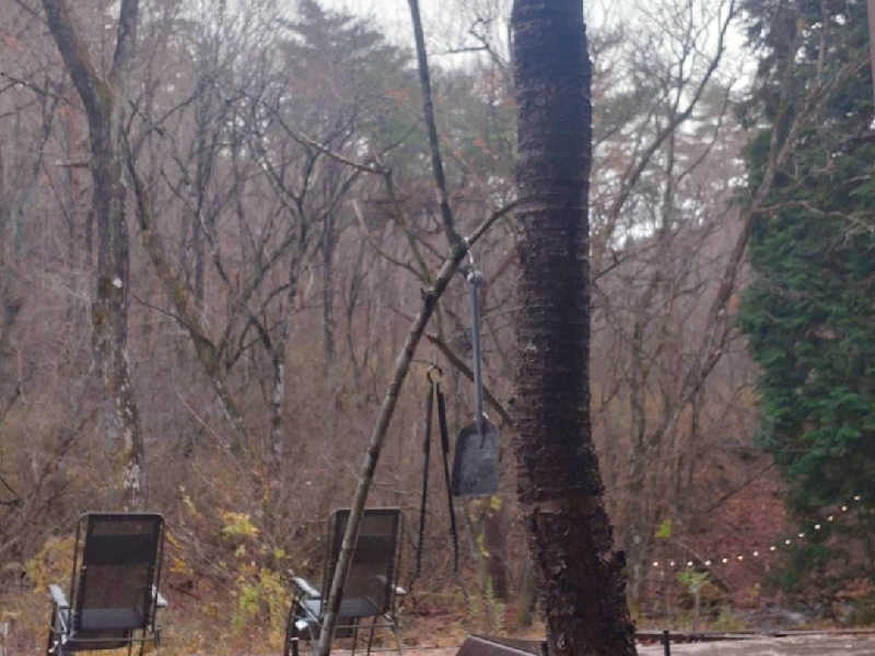 車を停めて外に出ると、ふわりと香ばしい焚き火の煙が鼻をくすぐった。受付へと向かう広場には、広葉樹が燃える焚き火台があり、その柔らかな香りに迎えられ、私の心はすでに安らぎという名の絨毯に包まれていた。