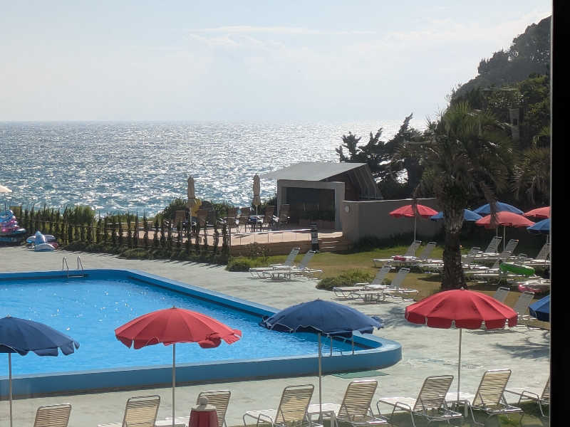 ホテルのプールは通常通りの賑わい。ホテル敷地は高台にあり安全。プールエリア隣接の貸切テラスにてサ活開始。