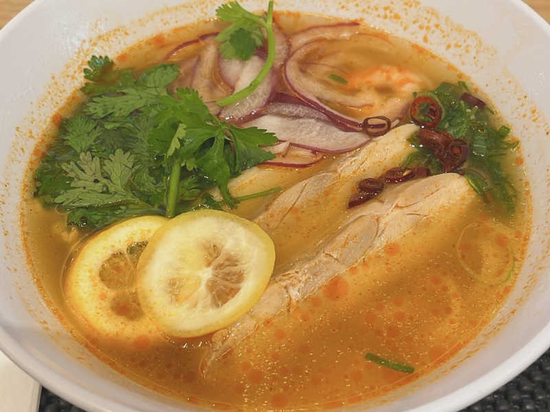 鶏肉ゴロゴロ・4切れくらいに、海老も2尾!具沢山で、ナンプラーベースの香りも本格的◎