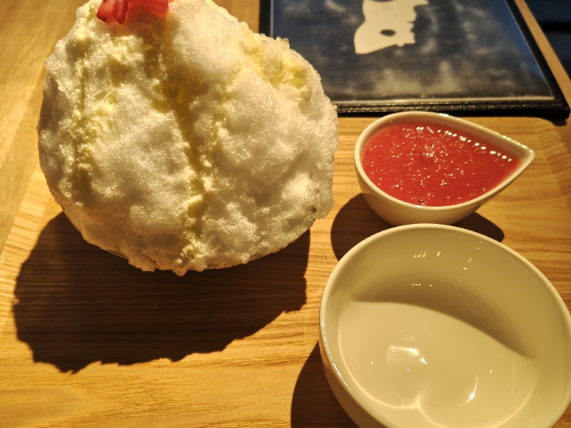 キメの細かい氷にいちごピューレをかけていただくいちごミルク味です