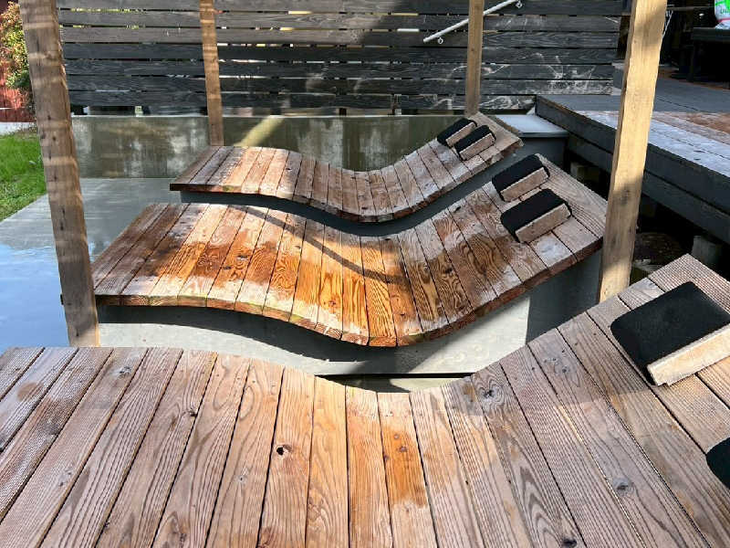 ゆるやかな曲線が美しい外気浴ベンチへ