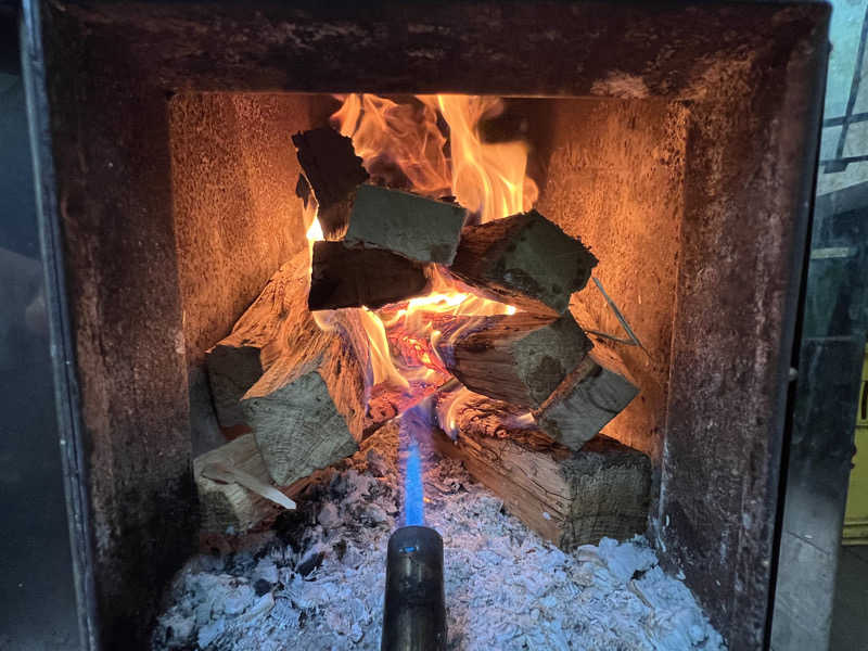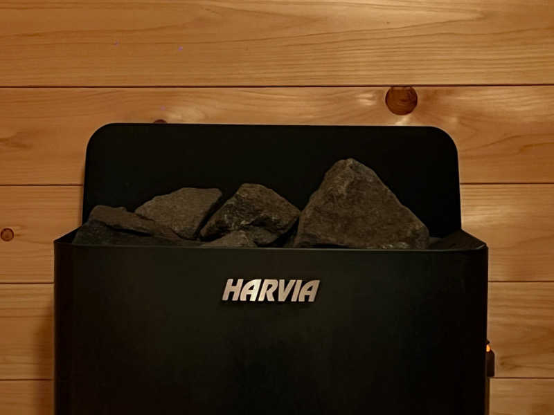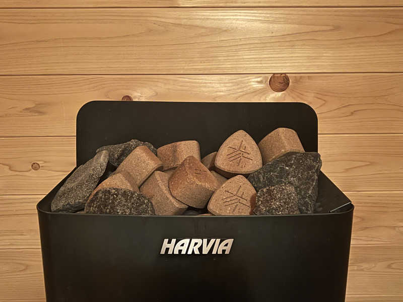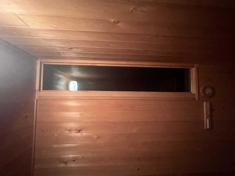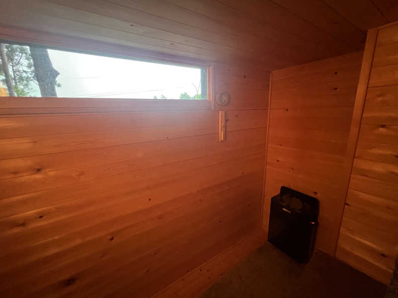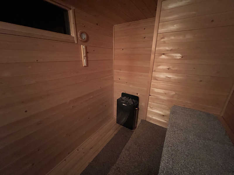 室温80〜85度、2段作りの室内はロウリュ可能で、天井近くの2段目はすぐに蒸気が降りてきて体感温度が高まりとても気持ち良い。