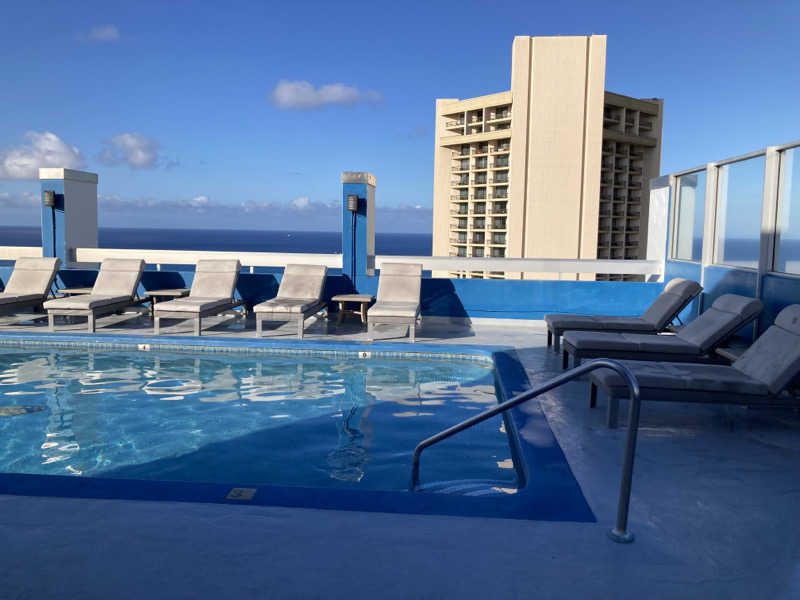 水風呂は一階上がったプールを利用する感じでしょうか。ぬるいですが、ないよりは良いです!最後はプール脇のリクライニングでワイキキの風を受けながら…とはいかず、高所恐怖症のためほどほどにあがりました。。次回はしっかり入ってみたいと思います!本日もありがとうございました。