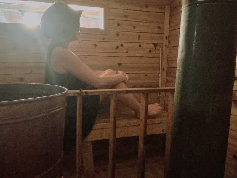 サウナは…庭の中の小路を進んだ先に現れた。小さな扉を入ると目の前に階段があり、登った先に薪ストーブがある。階段で上がっていくので、ストーブの上部が座面のすぐ横に来る。ニッキの木を浸したロウリュ水をかけると、あっという間にニッキの香りいっぱいの蒸気が降りてくる。サ室温70度からのスタートだったが、湿度が70%という高湿度のため、汗の出方は半端ない。 お父さんが時々薪の様子を見に来てくれて、小屋の外側から薪を投入。熱くして欲しい時は、お父さんにお願いすれば薪を多めに入れてくれます(๑•̀ㅂ•́)و✧