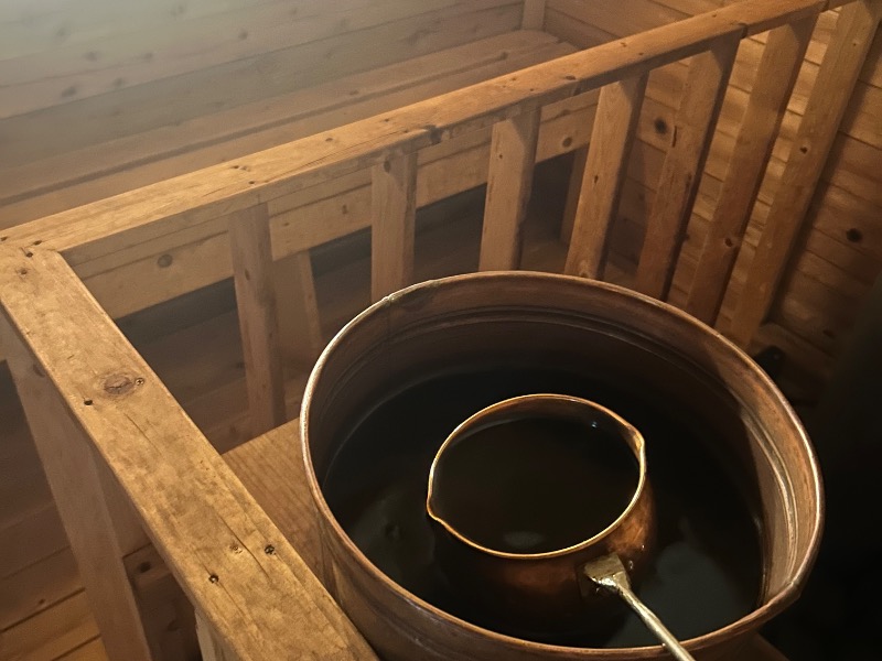 ニッキを煮出して作った茶褐色の水でロウリュすれは、サ室いっぱいに広がるニッキの香り🪵