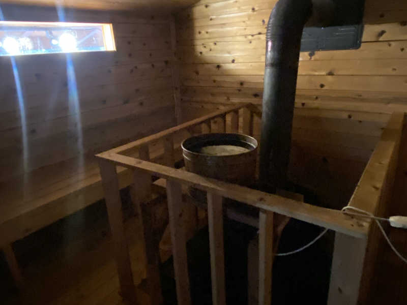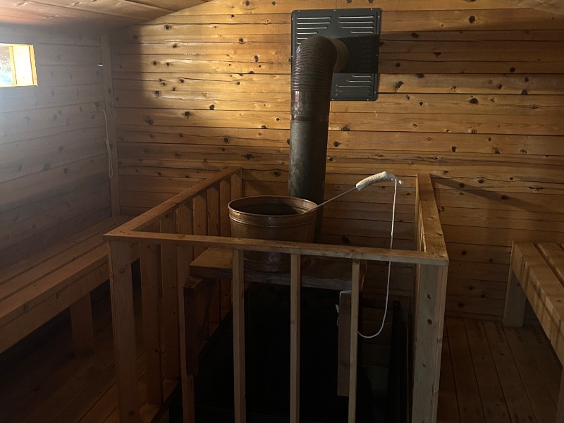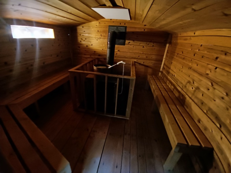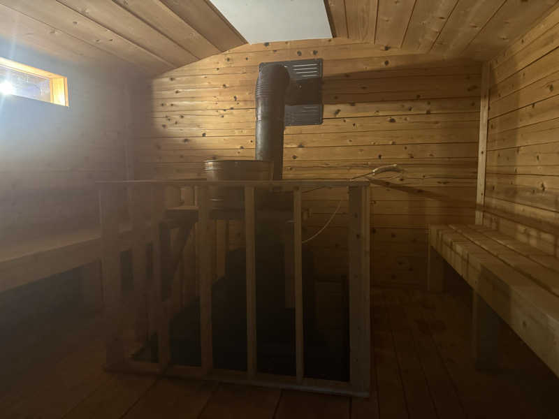 暫くして無事全員到着→持ってきたもの全てサウナエリアにセッティングして準備万端。ノンアル乾杯から始まり、皆でサ室行きます。背の低い扉をくぐり階段を上るとサ室がドーン💥9名ほどは問題なく入れるな😆少し低めの位置に設置された薪ストーブを囲むようにベンチがコの字で配置。