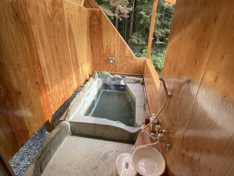 サウナのエリアにトイレと露天風呂が追加され、これから着替えはその露天風呂の脱衣所でするみたい。2〜3人も入ればいっぱいの広さながら、ちゃんと新品のシャワー付き洗面台とドライヤーの準備あり。露天風呂は数人一緒に入れるだろうけど、体を洗えるのは1人分のスペースなので譲り合っての利用となりそう。