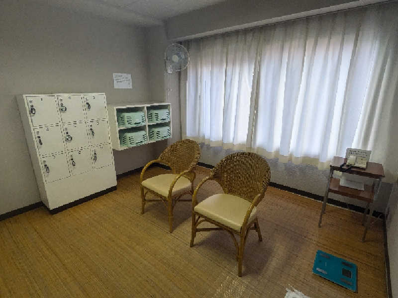 休憩。洗い場の椅子に座って休憩。脱衣所の椅子で扇風機の風に当たって休憩するのもあり。