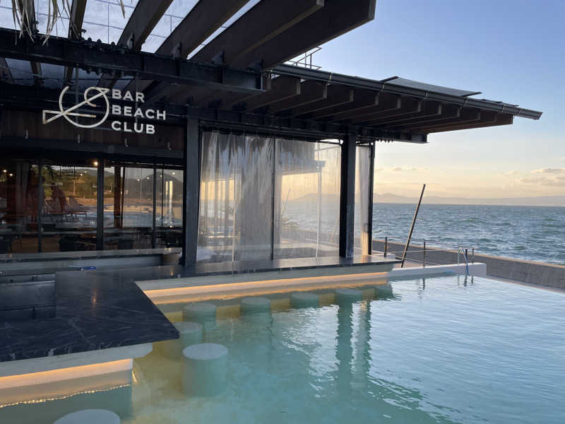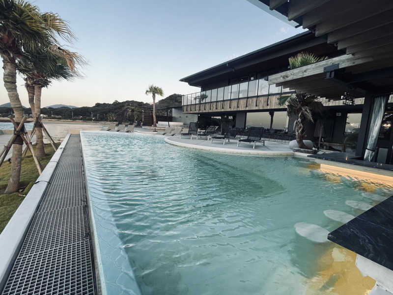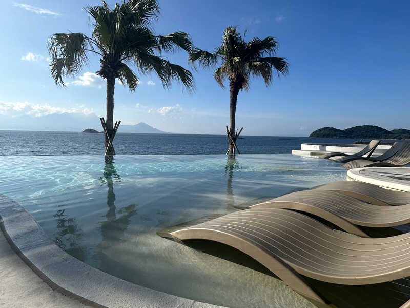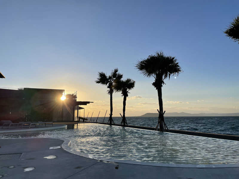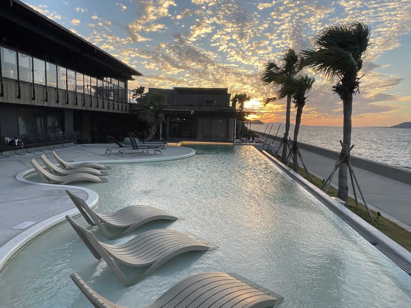タイマー1周で水風呂へ。シャワールームと水風呂がすぐそこ。水風呂は深さがかなりあって、立ってても胸あたりまでくるぐらい。ちょっとぬるめの20℃だけど、この時期にはちょうど良いかも。ゆっくりクールダウンしたあとは、プールサイドのととの椅子へ。夕方はちょうど夕日、朝は日の出の時間帯だったから、空の色がどんどん変わっていく様子を眺めながらくつろぎのひと時。天草四郎時貞もこんなリゾートができてビックリやろぶっとび。