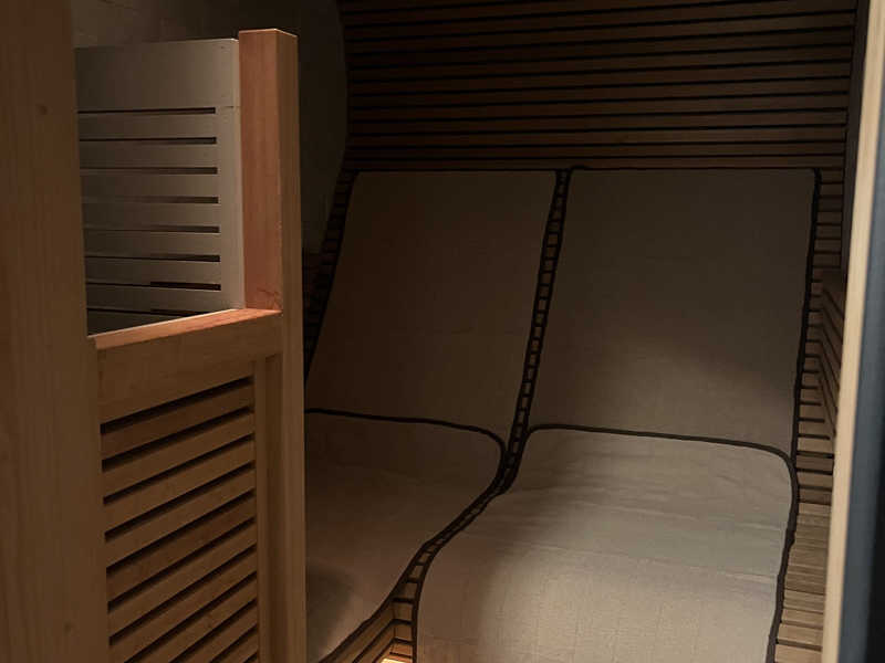 サ室は2人がゆったり座れる大きさで、背をもたれても熱くないようにマットが敷いてあり快適。
