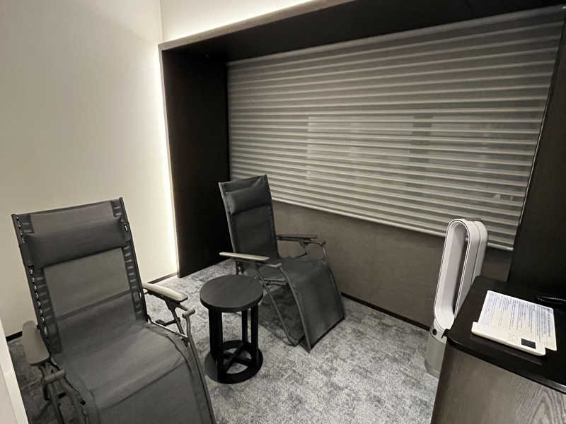インフィニティチェアが2台置いてあり、バスローブを着てととのうスタイル。何か富豪になった気分w🤣。小さな冷蔵庫にはミネラルウォーターが2本入ってあり、これは嬉しい😄。
