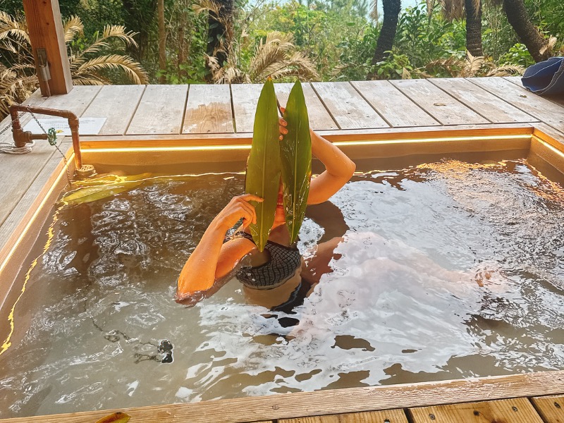 月桃入り水風呂。 月桃(げっとう)は奄美大島では「さねん」と呼ばれ、亜熱帯地方でしか育たない貴重なショウガ科の植物です。肌や精神にさまざまな効能があると言われています。 <月桃の癒し効果> ストレスを和らげ、リラックス効果もあり、浄化、再生、循環と、女性のリズムに寄り添った植物と言われています。月の満ち欠けの力を持ち、女性と関わりの深い植物です。月経を整えてくれたり、体のむくみの改善、更年期の症状にも有効で、体内の毒素を排出してくれると言われています。