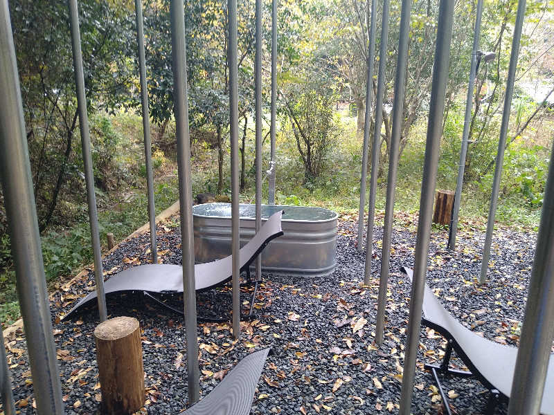 見た目は洒落ていたので、アウトドア系サウナで、どうかなーと思いながら、水着に着替え、「木のサウナ」へ移動。荷物掛けるところもあった。レンタルは水着とバスタオルを借りて、ポンチョはやめた。休憩ではバスタオルを掛けることにした。