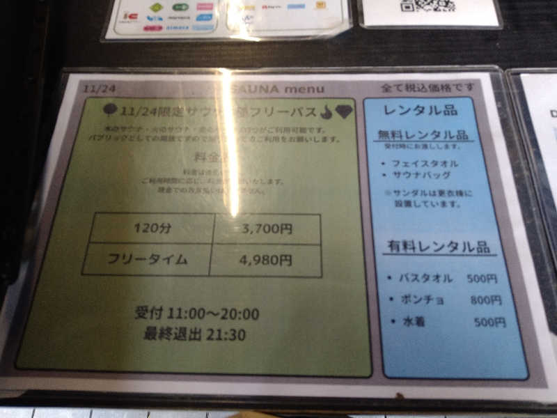 料金は後払い制で90分、120分、150分と自分で時間を見ながら楽しむスタイル。今回は水着やタオル等はレンタル。サウナは3つあるが、土日祝はパブリック解放しているサウナは「木のサウナ」のみ。