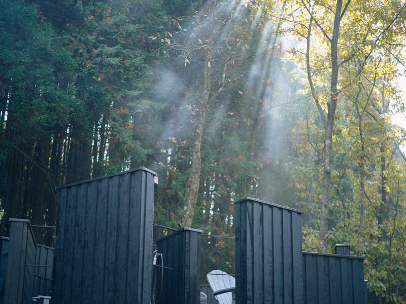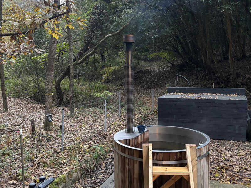 地味に嬉しいのは木のサウナの横に40度の湯船があること。熱源はもちろん薪。