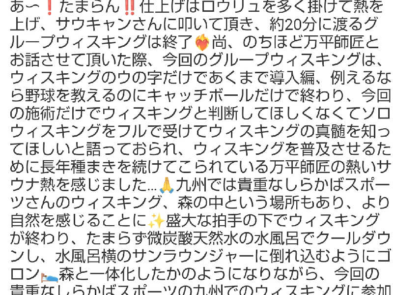 万平師匠のウィスキングは3年前の九州サウナオールスター感謝祭以来で、九州で受けられる機会は今後もなかなかないと思われ、またサウキャン大西さんは私も出席させて頂いた一昨年4月のサウナ文化大交流会に出席されていて、改めてご挨拶したいと思い、スタートを飾る11時の回を予約受付開始直後に即申し込み🖥️そして今日を迎え、しらかばスポーツさんのウィスキングと、こちらのウィスキング導入による更なる進化にワクワクしながらライドオン😆受付開始を待っていると、早速この豪華なイベントに参加されるサウ仲間の皆様と偶然‼️偶然🤩しばしサウナ談義に花を咲かせ、受付開始に😀ご挨拶し、今回の豪華なイベント開催の熱い温冷を申し上げました🔥🙏説明を受けて、脱衣所で水着に着替えてイン🤗そこでまずは、今月26日から開催される九州ジモサウナデー2025のポスターがこちらで撮影されたことから、同じアングルで写真を撮ってもらう九州ジモサウナデー2025ごっこを🤣当初はサウ仲間の方に撮影をお願いしていましたが、何とこちらのサ守でウィスキングマスターのエイキチくんが撮影して下さることに😃また、このごっこ遊びのことは全く話してませんでしたが、「浜﨑さんの真似をするんですか❓」と、完全に思考を読まれていました…😂結果エイキチくんがポスターの写真と比較しながら撮影📷️エイキチくん、大変熱く温冷申し上げます🔥🙏そして万平師匠、サウキャン大西さん、トシキさん、かぼちゃさんにご挨拶を申し上げてから今日のスタートを飾る木のサウナでの万平師匠ととサウキャン大西さんのグループウィスキングに🌿スタートから終了まで万平師匠がウィスキングについて詳しく説明しながら、まずは万平師匠がロウリュしてお二方がウィスクで蒸気を撹拌😁参加者にはオークのミニウィスクが配布され、それから更にロウリュして上の蒸気で葉っぱを暖めて開いてからセルフウィスキングに😀次いでグループウィスキングでよく行われる、隣の方の背中を叩くことに😄それからスクラブが配布🤩今回は保湿ということで、アボカド、バナナ、ヨーグルト、ハチミツ、