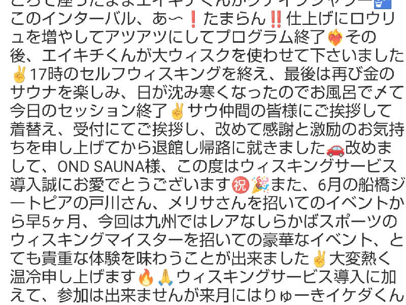 一日中楽しみました。ウィスキングが加わり、今後のOND SAUNAがさらに楽しみになりました。