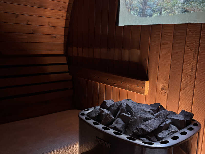 山賊サウナにあるのと同じMOKIストーブかな。セルフロウリュもできるので、セルフ山賊ロウリュを堪能!!いい音で石が鳴き、サ室は熱々に。たまりませんな。