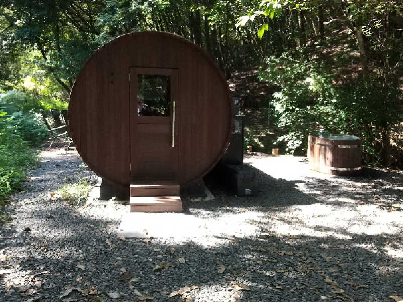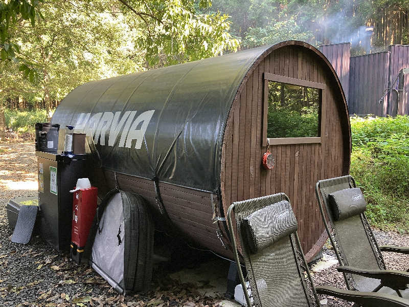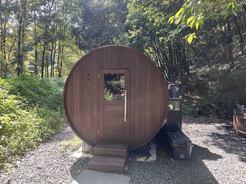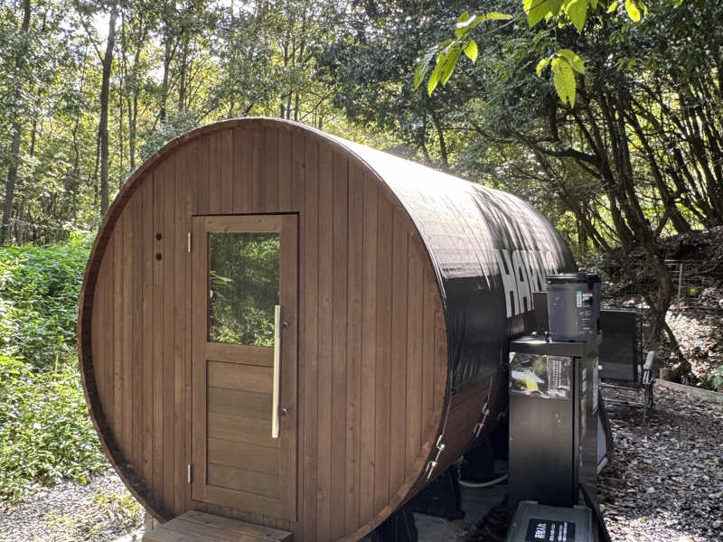 火は前室付きのバレルサウナ!初バレルだったので入れて嬉しい!狭めなので、ロウリュ1杯で十分なほどの温度感になる!