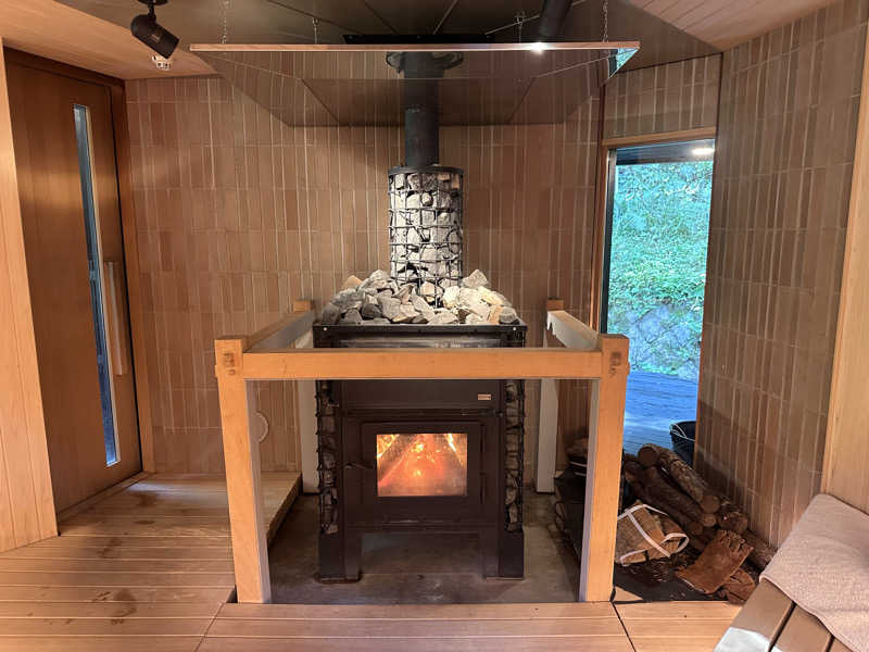 木のサウナは大きな薪ストーブ。サ守さんが丁寧に案内してくれた後にレモングラスロウリュしてくれた。