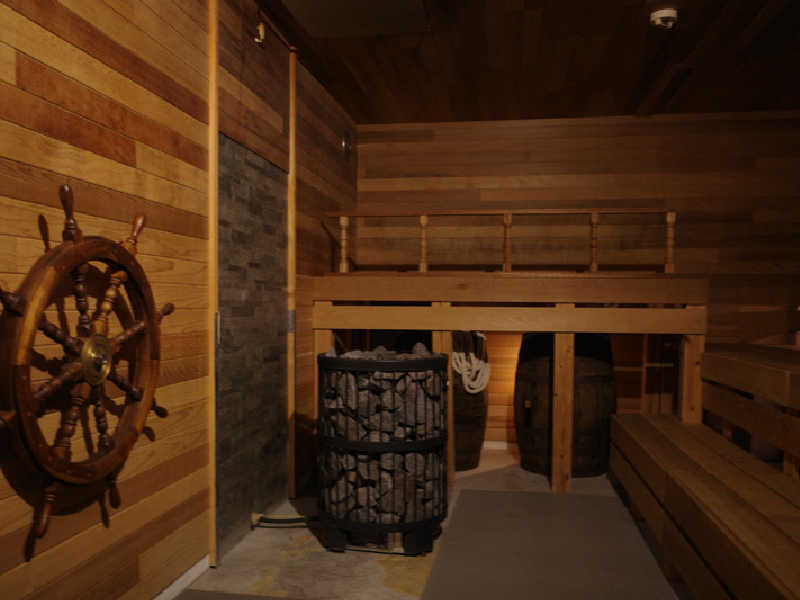 サウナ室は大きく、帆船イメージなのか、舵のようなオブジェがあったり、間接照明な感じがオシャレ。