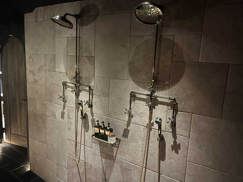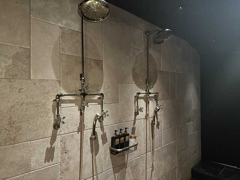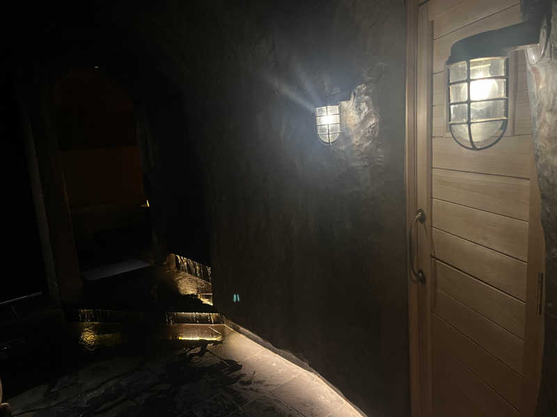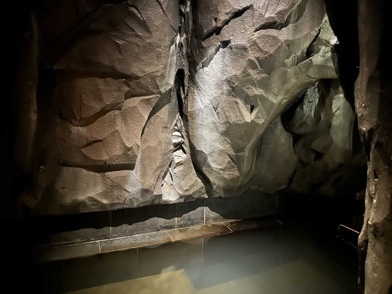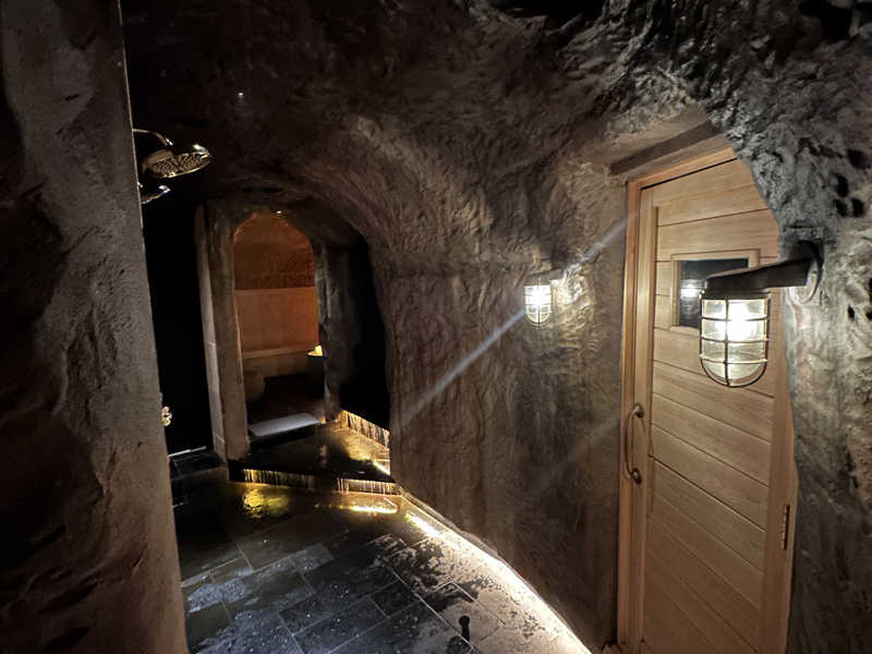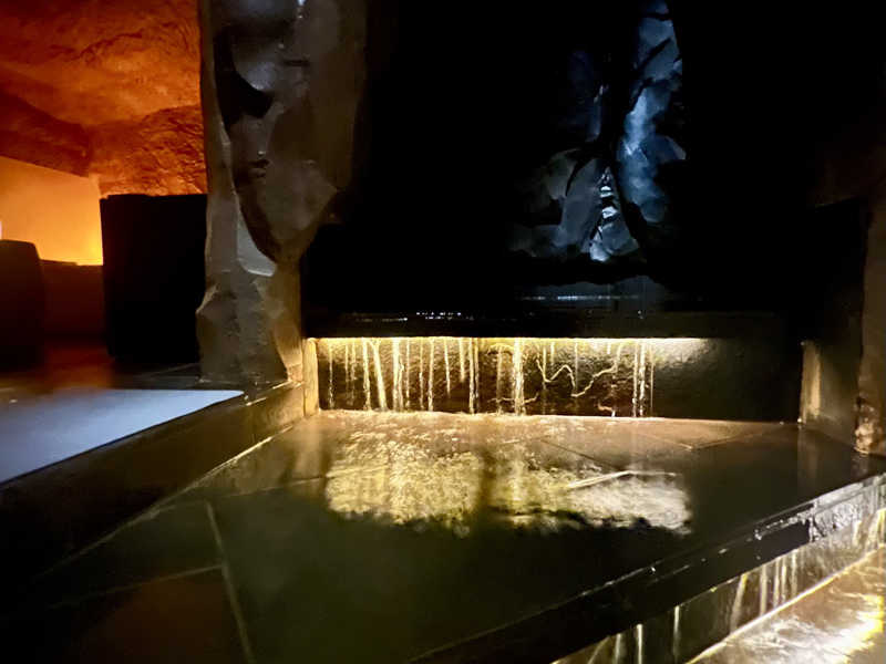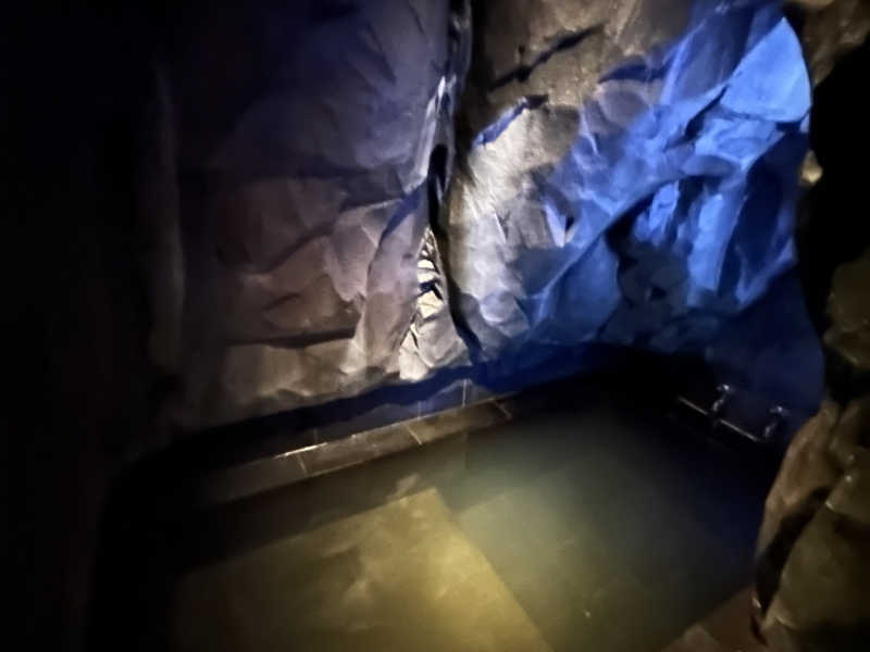 サ室出て正面にシャワー、数歩で水風呂🐾地下水で硫黄の香り+垂れ流しで常に水が流れてるのも洞窟っぽくて世界観よかった✨ノンバイブラ、顎下まで浸かれる水深◎暗い空間にミニチュアにプロジェクションマッピングみたいな映像が動いてて可愛かった❤️キンキン水風呂が苦手なわたしもつい眺めながら長居できる心地の良い水温でした🫧