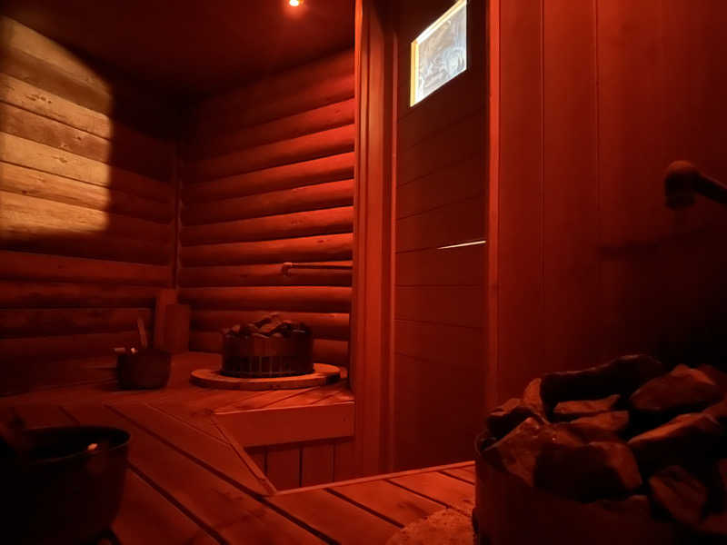 扉を開けると1段小上がりになっていて、フルフラット。入った瞬間は何も見えないくらい真っ暗!すき🫰🏻ストーブは2台!!天井は162cmのわたしが立つともう少しで頭が当たるかも?くらい低く、ストーブの2/3くらいは床下で、フルフラットでも熱くなるように工夫されてる♡扉から右手のストーブはオートロウリュが高頻度であり、セルフロウリュもできちゃう❤️🔥左ストーブにセルフ3杯直後に、右ストーブのオートがきたときはアッチアチすぎて最高すぎた🥰🔥