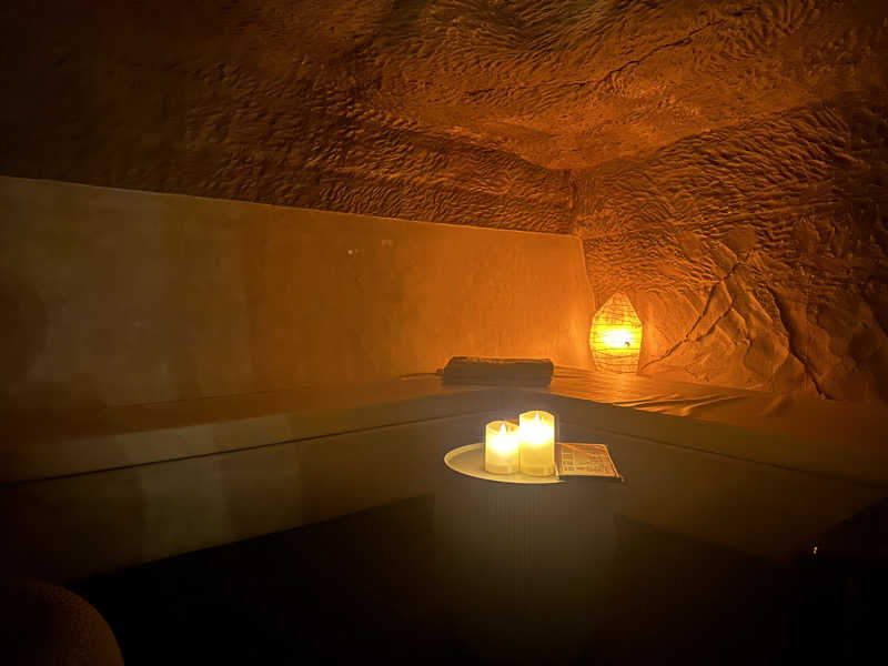 洞窟の中で暖を取っているようなイメージ🔥内気浴なので空調にもこだわっているようで雰囲気を壊さずに湿気が籠らないようになっている👏無印にありそうな麦っぽいおしゃれな丸イスが2つとソファがL字にある。2人なのでタオルを引いて寝そべったりもできて自由に使えたのがよかった!冷蔵庫もあり1人1本水が用意されているのがありがたい!お香が焚かれていていい匂い𓂃