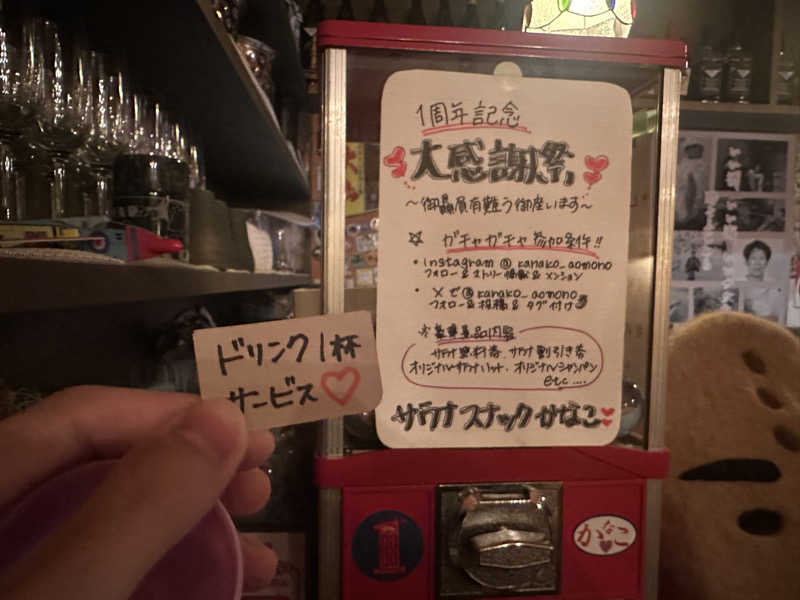 かなこは10月1日で1周年ということでステッカーやSNS投稿でガチャができる!ドリンク無料券とチンチロ券が当たり、チンチロは1・1・2で惜しくもピンゾロならず!ドリンク無料券に化けて🈂️後に2人でオロポを飲みました🥤