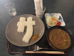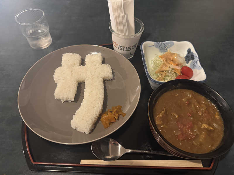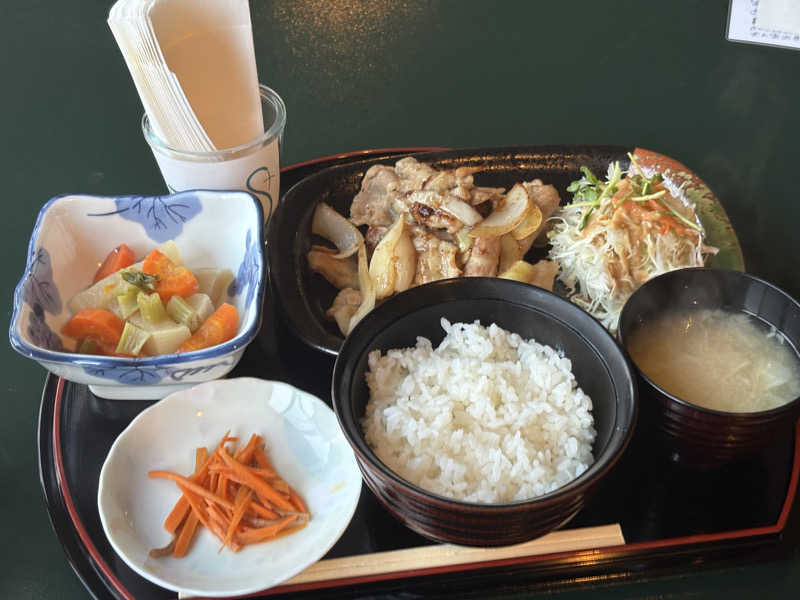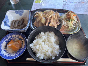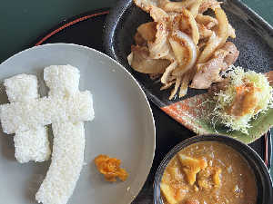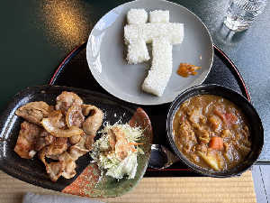 サの文字が芸術的。カレーも具だくさん、生姜焼きも肉が柔らかくて美味しかった。