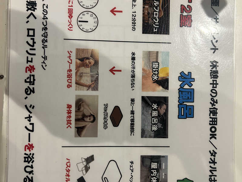 会話NGサ室は暗い。ドアを開けて入室しても暗さに慣れるまで人が居るのか良くわからない。タオルを敷いてベンチに座ると12分計が6分を示す。早速ロウリュタイム。ストーブ前に立つとロウリュ時の声を発してOKなのか躊躇したものの小声で「ロウリュします。」と言うと「お願いします。」も小声での返答。射熱板がないもののロウリュして暫くするとベンチにイイ感じの蒸気が降りてきました。