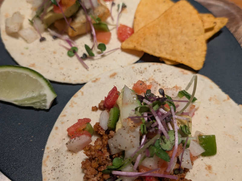 さっぱりおしゃれなタコス。ドリンク一杯無料でありがたい🆓