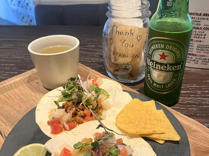 ハイネケンは瓶で飲んだ方がいいですよと定員さんからアドバイス はい! 優勝! タコス美味&ハート!