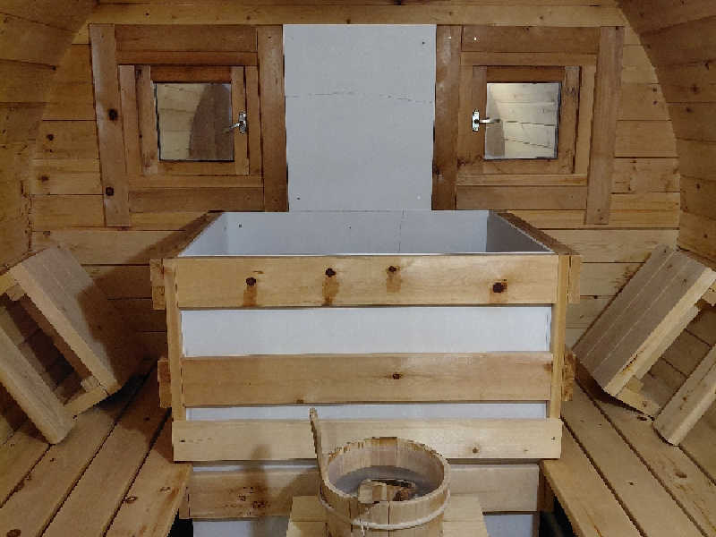 暫く待って60度まで温度が上がったところでピカピカのバレルサウナへ。2人ならゆったり広々。座面の幅も広め。