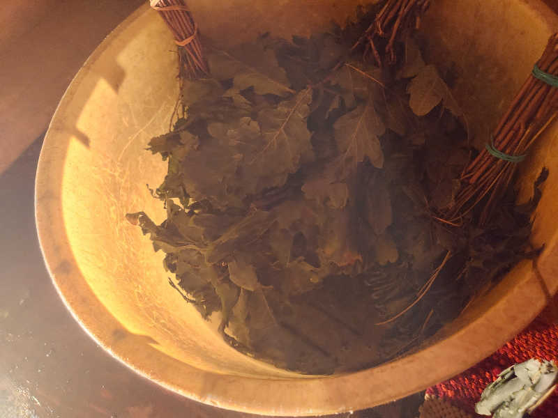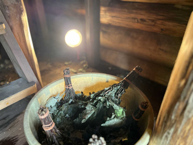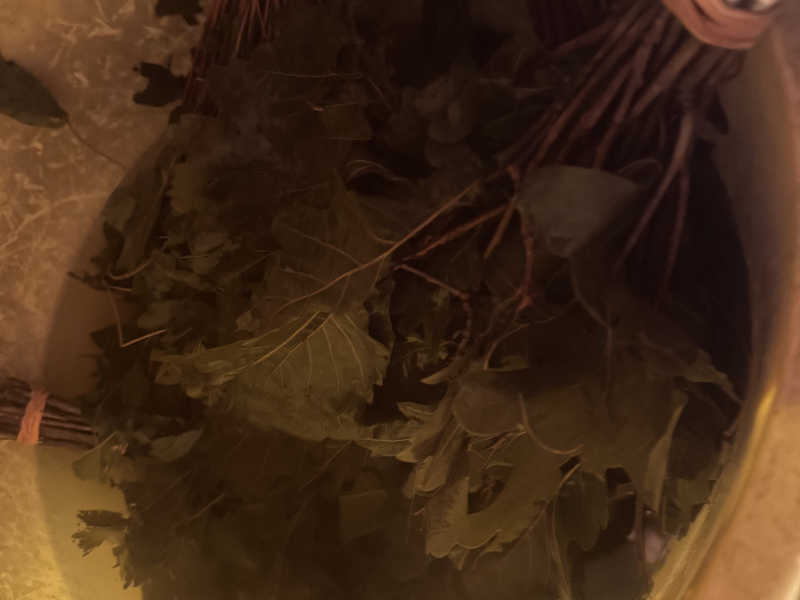 早速入ってみるとものすごく大きなストーブが!蓄熱式で事前に熱された300キロのストーンが入っているとのことでさすがの存在感。中はそれほど熱くなく、ストーブの蓋を開けたり、そこからロウリュをしたりで熱や香りを楽しむ模様。そしてこの日はヴィヒタも用意していただきテンション爆上がり!本当にありがとうございます🙇🏻