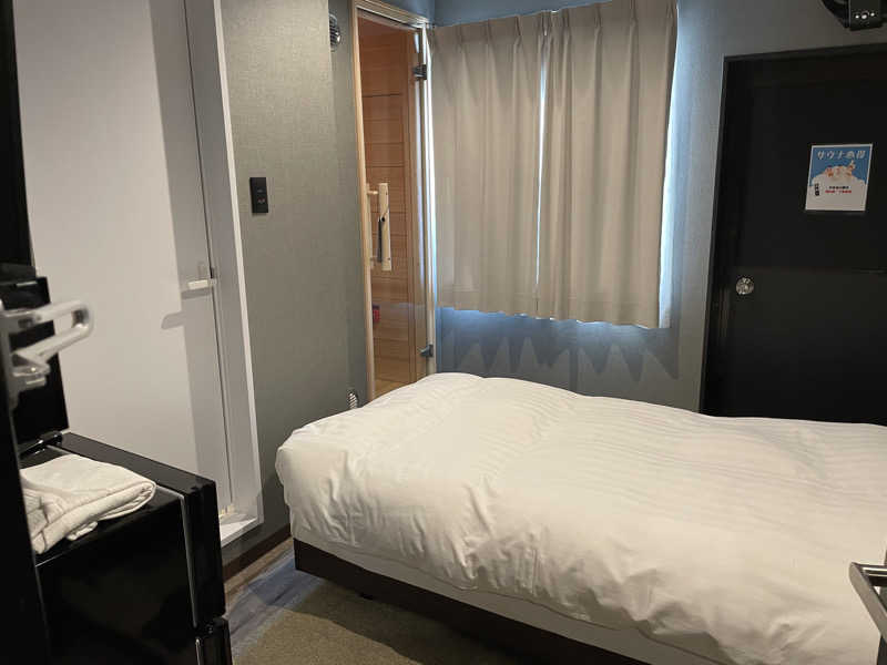 休憩はもちろんベッドにダイブ。普段はラブホサウナでしか味わえないこの“ごろ寝休憩スタイル”は最高の一言。天井の扇風機で風を回せばさらに快適。