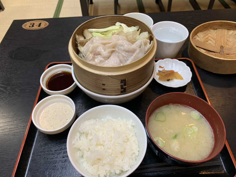 サウナの如く源泉で蒸された甘いポークと野菜に親近感を抱きつつ舌鼓。白米も美味い🍚