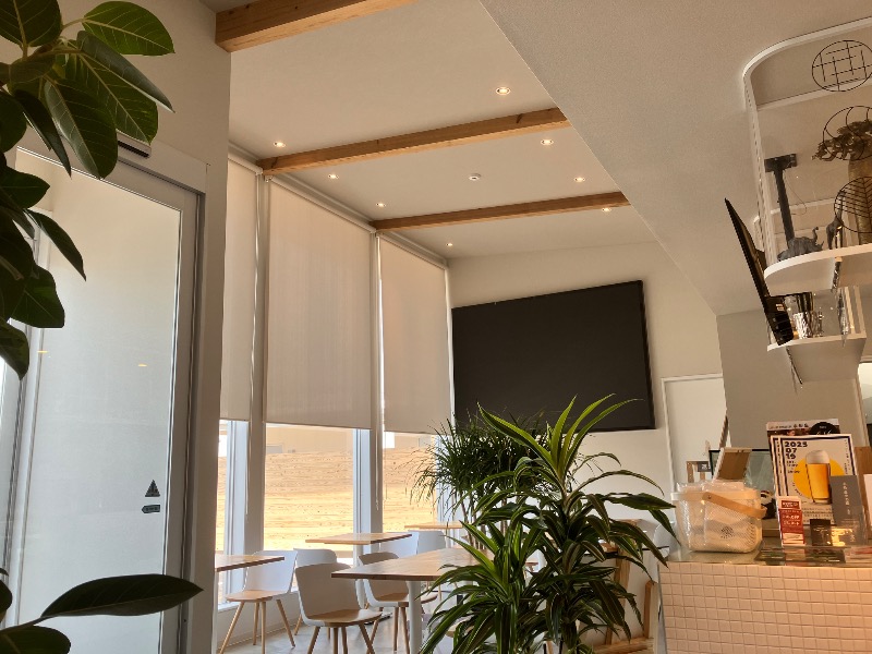 ロードサイドホテルといった外観から館内は、白を基調としたオシャレなカフェフロント。