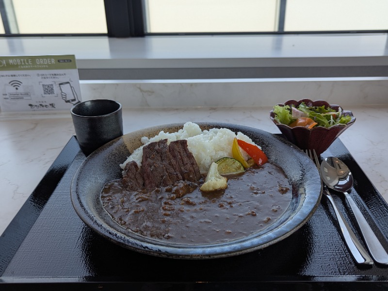 ごはん大盛り、オサレなサラダ付き 赤身ステーキがのっています