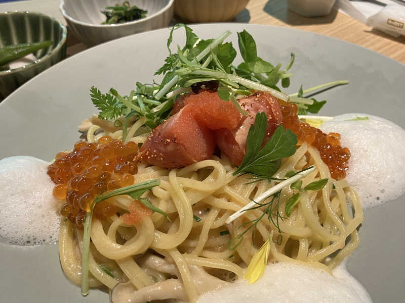 スパゲッティというより中太手打ち麺の印象。辛みはほんのり。ホタテは新鮮で北海道を感じました。