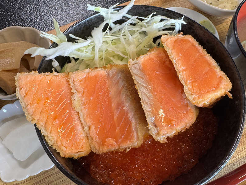 分厚いサーモンにサクサク衣 いくらの塩っけと相性抜群! ある意味親子丼ですね😊